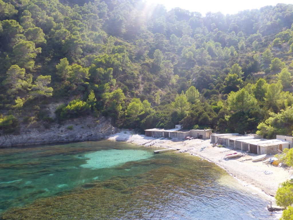 A special find was Aigues Blanques. Take the road from sant carles to cala st vincent and after km-marker 16 take right to ‘aigues blanques’. At the end of this road you can park and walk down .. but the real local place is to turn rt at the car park, follow the road for another 500m and look for an entrance on the left. Park around here and walk through the entrance and down to unmarked beach.  Unfortunately a big storm took some of the beach away so it can get busy.