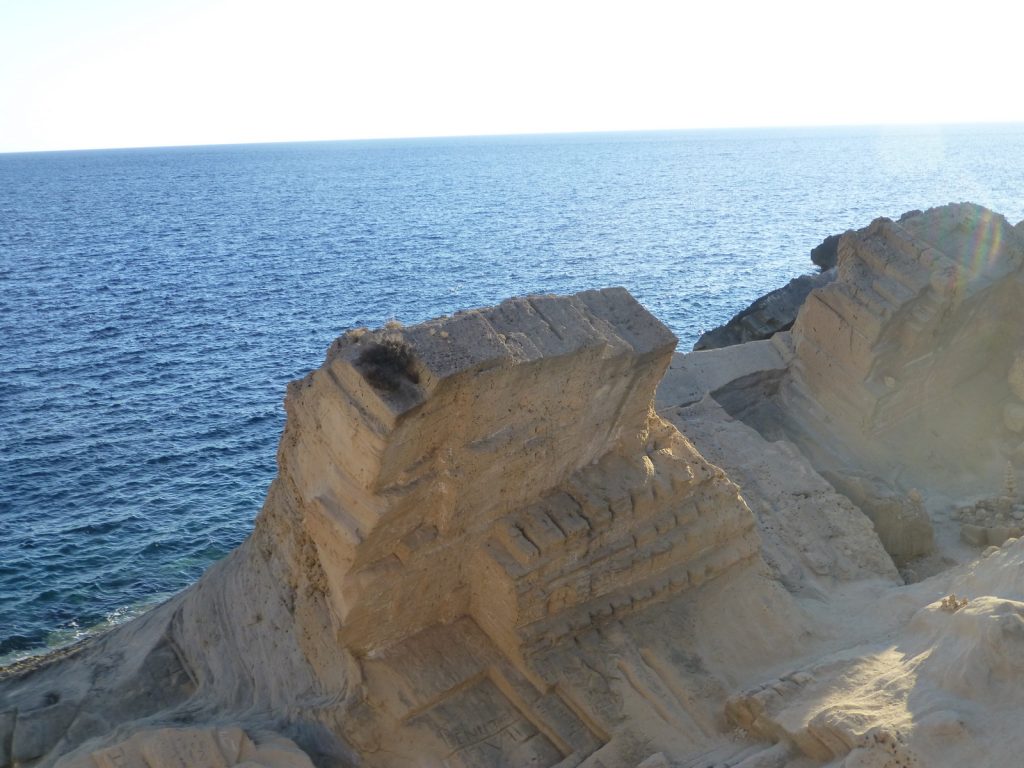 This is actually the quarry at Sa Pedrera where they mined the stone for Dalt Villa. Follow the road to Cala D’Hort (a rather nice place with -the rock- but touristy) and at the top of the hill before you go down to Cala D’Hort opposite a white building there is a untarmac’d road to the left. Follow this to the parking. If you go right you go no-where, straight on is to the Torre des Savinar and a bit to the left, up and over the hill and follow the path down the hill under the cliff face to the sea,