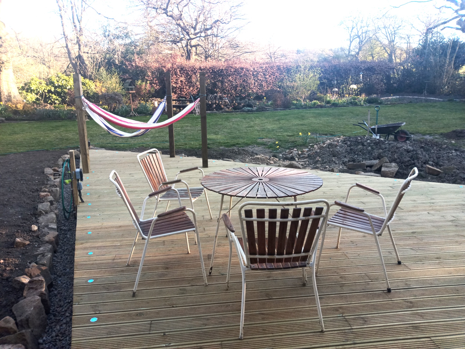 Once again we’ve had superb spring weather this year and Ang/I moved outdoors in late March to get back into the garden to rescue it after 2 years of neglect. I have also built 40sqm of decking which was an inordinate labour of love, putting in foundations that a digger has compressed for a year while building the house. And of course endless faffing with the home-controls system.
