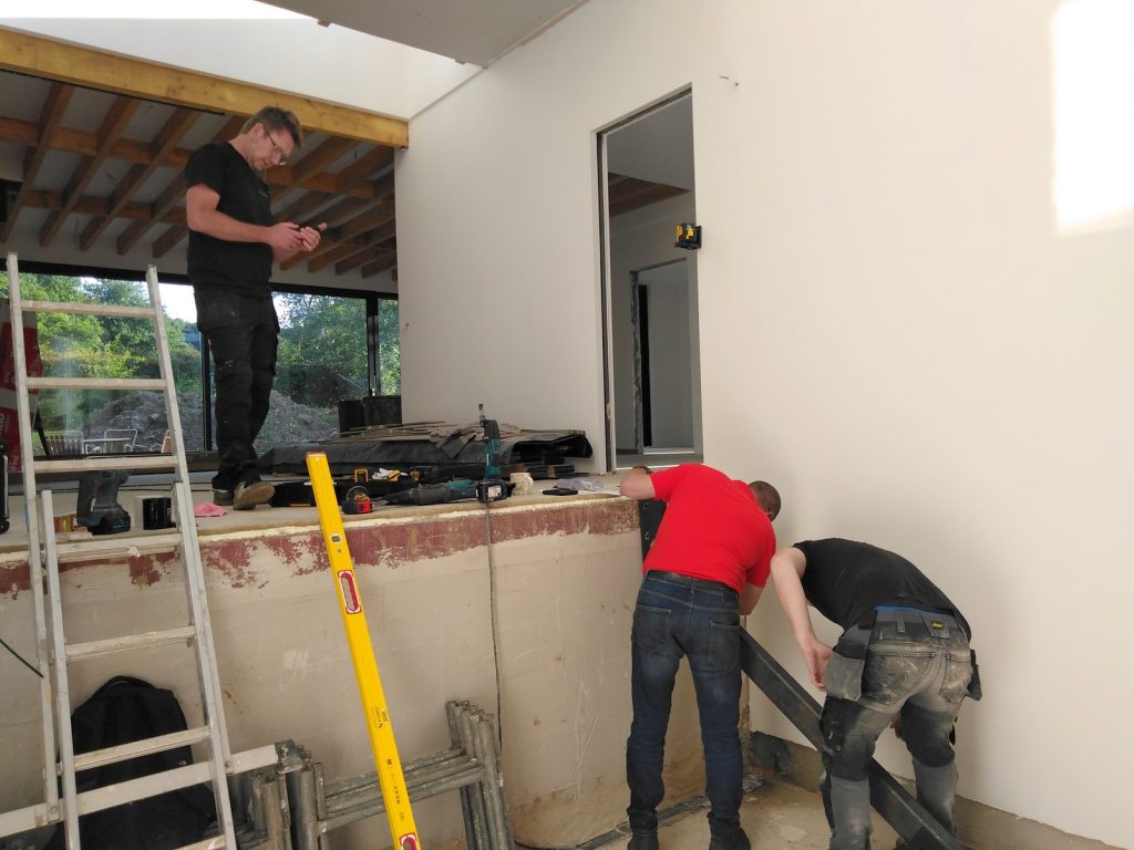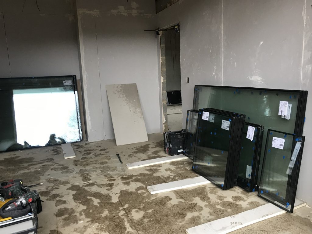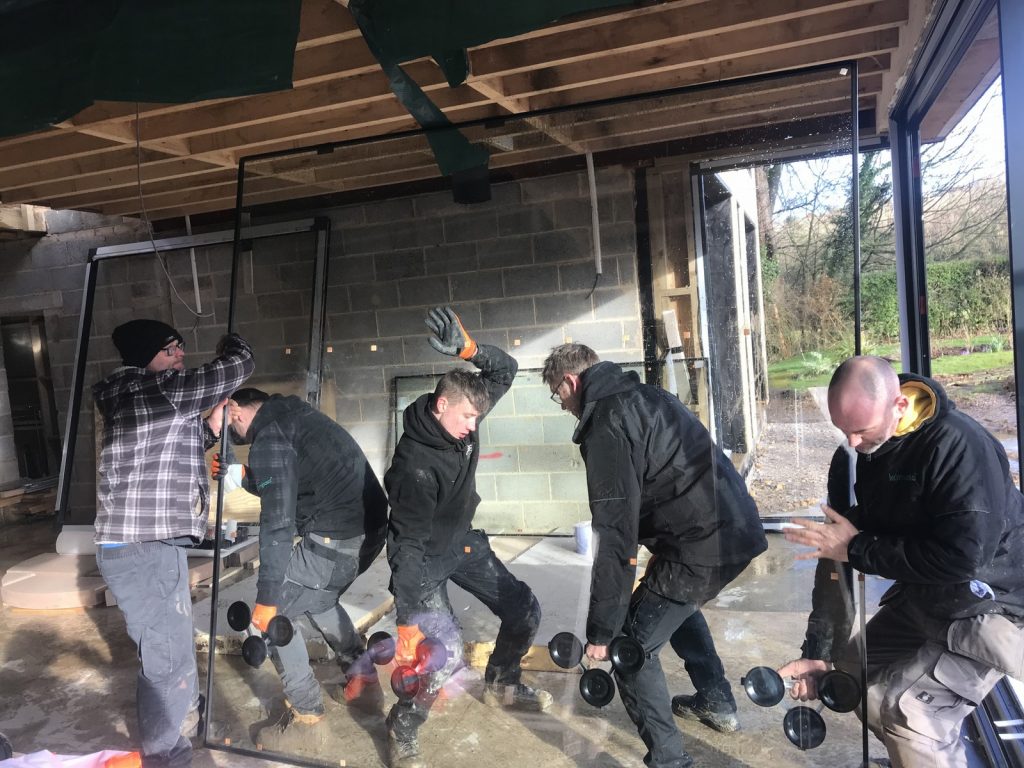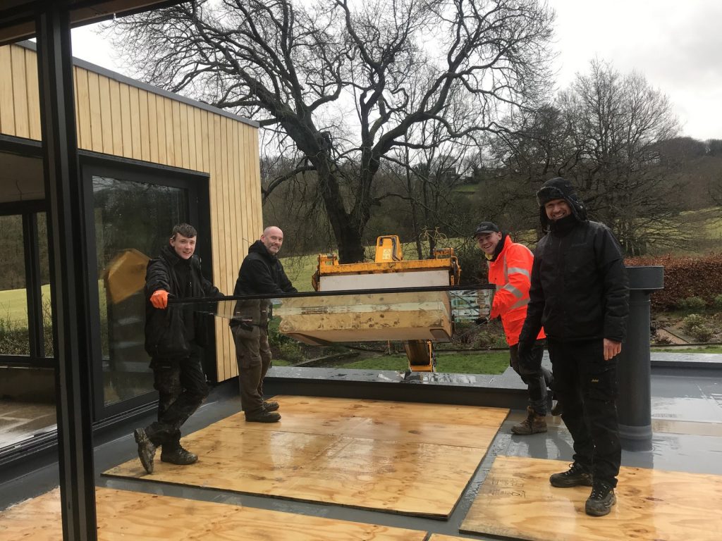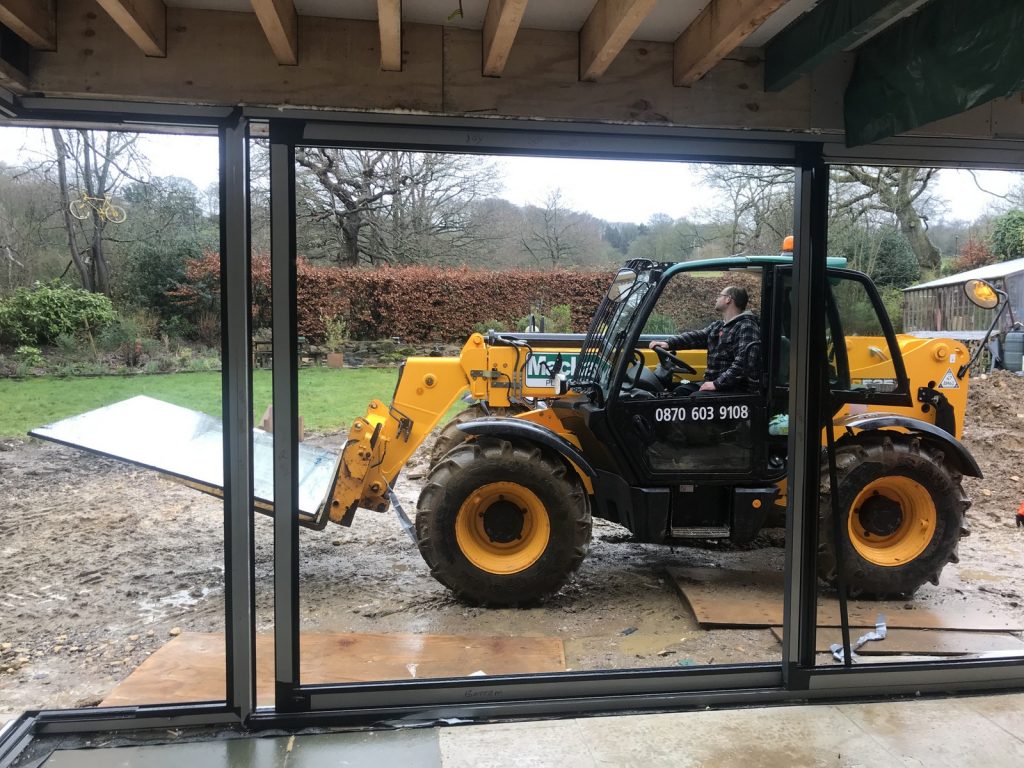 Kompass, the window guys (Steve, Olly, Paul and Will) have been on-site for the past few weeks installing all the windows. 35+ windows and sliding doors installed and we had to hire a telehandler to move some the bigger ones around. The lounge sliding door was over 4sqm, 350kg that took five of us to lift into place .. QSP would have had a dicky-fit with the breach of ‘t elf and safety. I’m dead pleased with them as people and the Reynaers product – Steve is sufficiently chuffed he wants to bring prospective clients around.