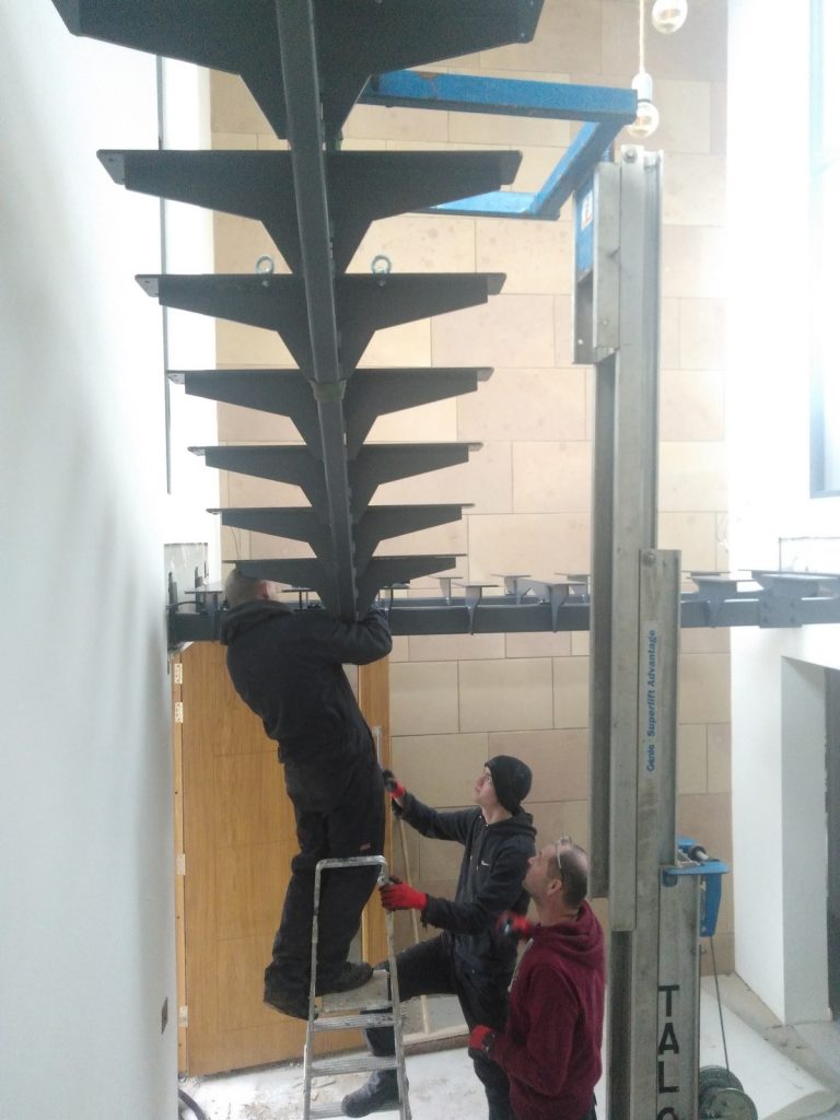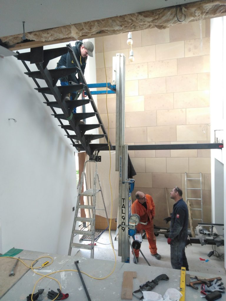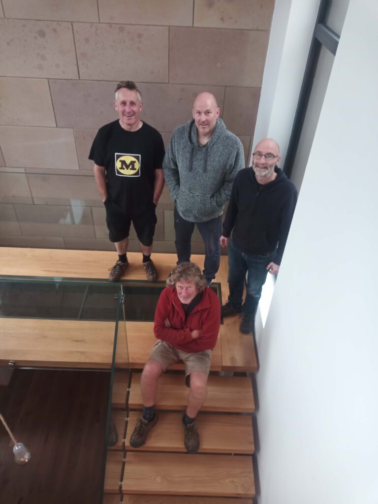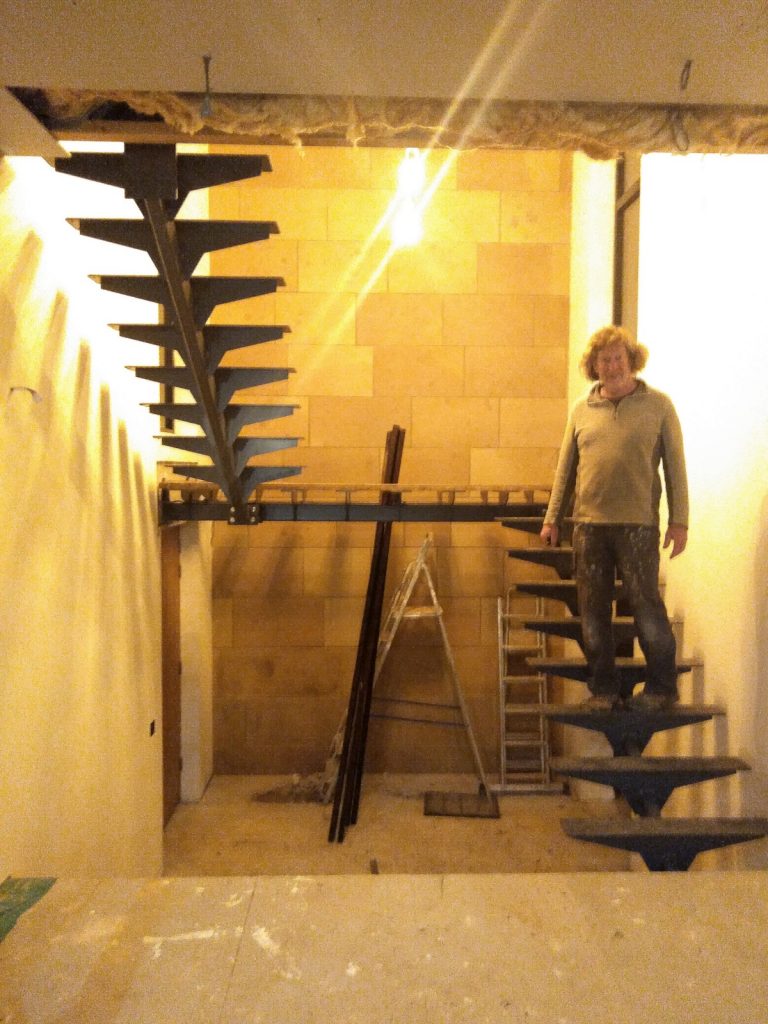 Finally, finally we are making progress with the stairs. Bob and lads from Ark Engineering have finally installed the metalwork and it looks a treat. Another of Alex’s recommendation, Dave Sykes is making the oak treads. Its a pretty complicated assembly with 4 pieces jointed and glued so they don’t crack. They are due next week so xmas will be varnishing 30 treads. Steve can then get on with the glass balustrading. Then ….