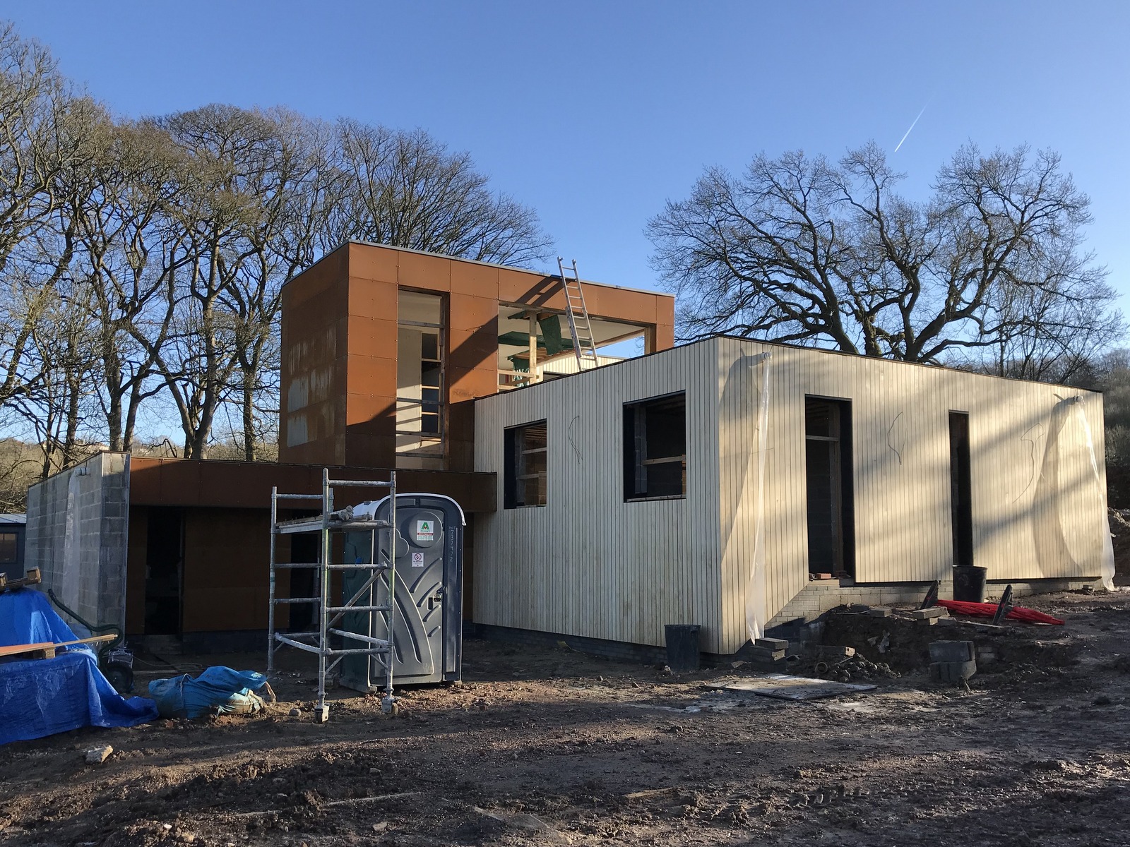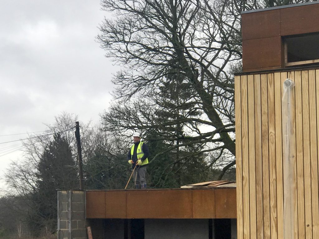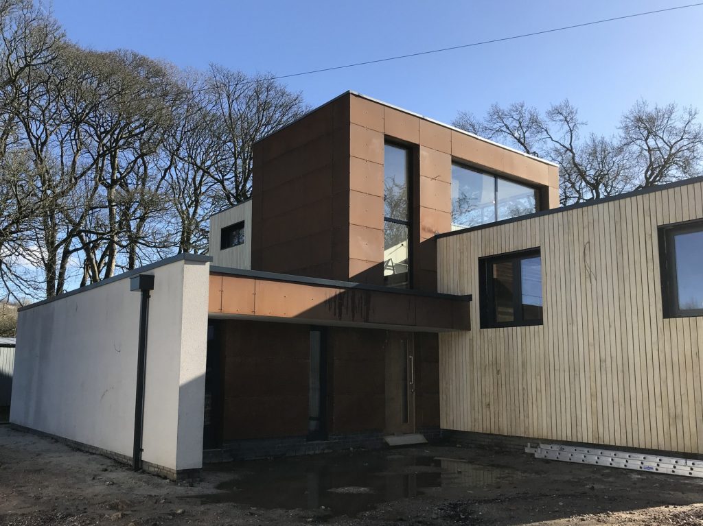 QSP have been back a couple of weeks and making good progress finishing their part of the project. The accoya and corten cladding is complete (barring the window reveals). Drains are complete and tested. The ground is levelled up – as much as possible with the wet ground and spoil. The workshop and main house doors are 2/3rds fitted. Barring the wet back wall of the garage all the rendering to garage and lower ground floor is done. Laid 10t of type1 to make n0n-muddy paths around the house, garage and static and I madea mini-rockery and steps the the door. The plan is they finish by end-month, apart from ……