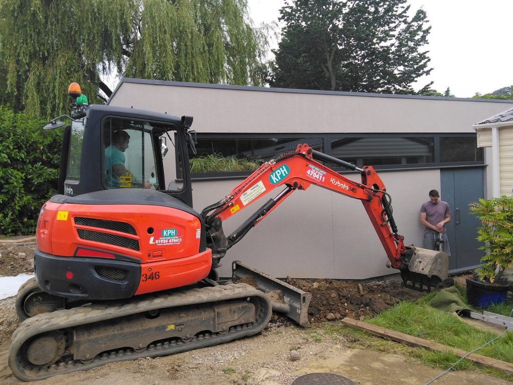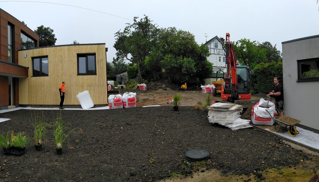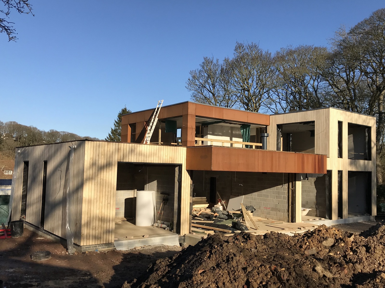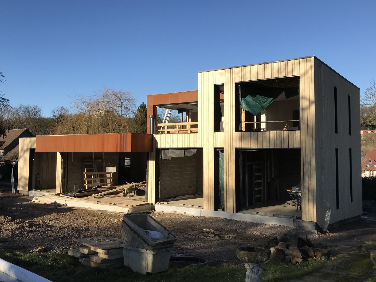 QSP have been back a couple of weeks and making good progress finishing their part of the project. The accoya and corten cladding is complete (barring the window reveals). Drains are complete and tested. The ground is levelled up – as much as possible with the wet ground and spoil. The workshop and main house doors are 2/3rds fitted. Barring the wet back wall of the garage all the rendering to garage and lower ground floor is done. Laid 10t of type1 to make n0n-muddy paths around the house, garage and static and I madea mini-rockery and steps the the door. The plan is they finish by end-month, apart from ……
