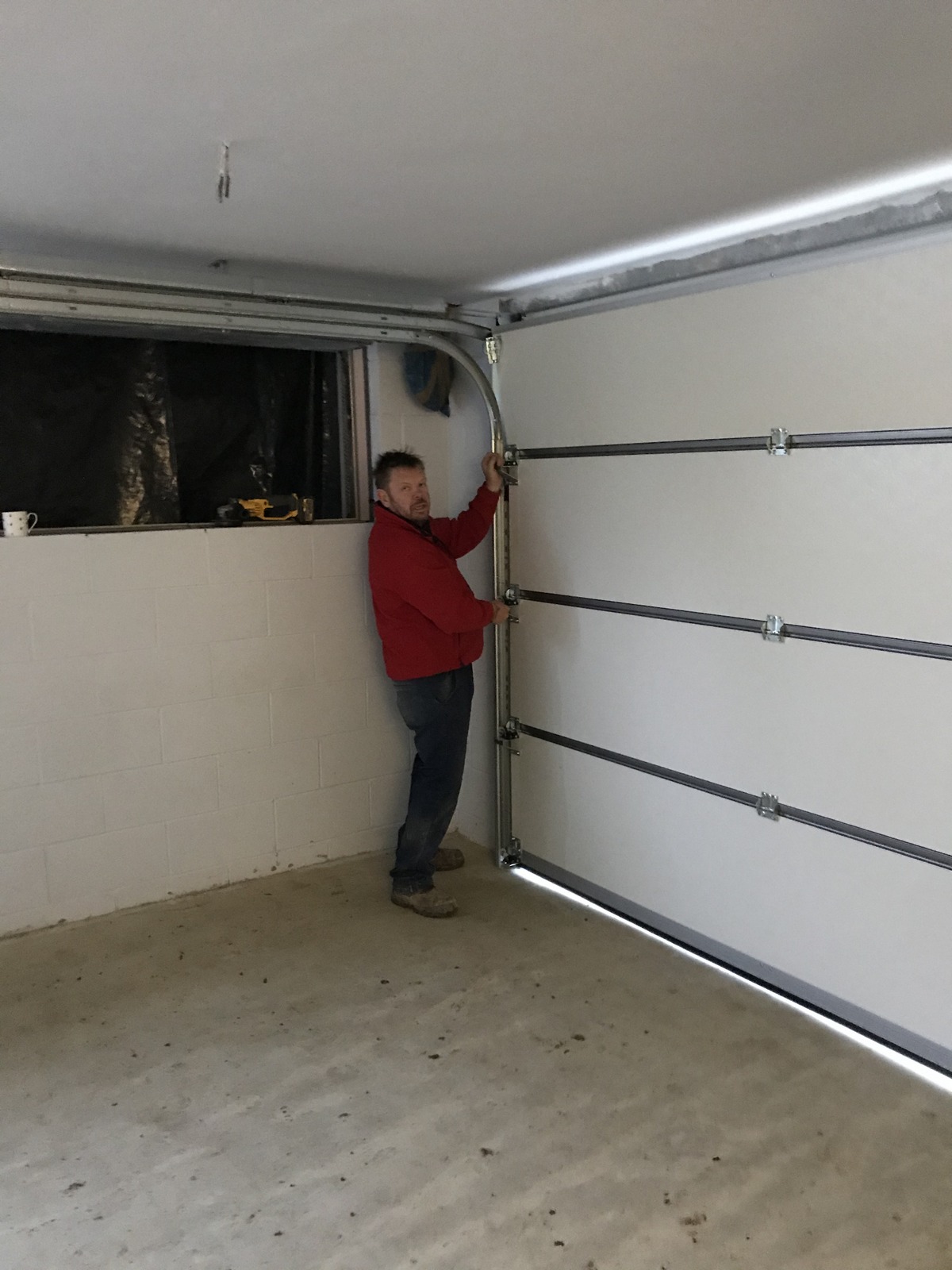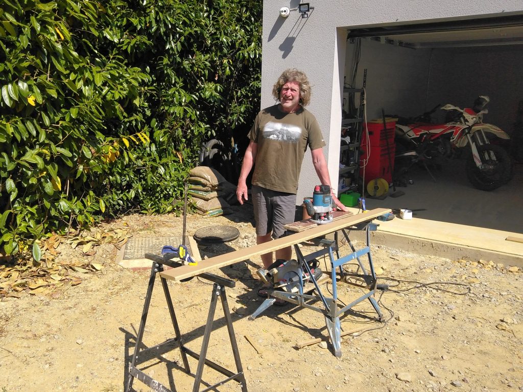 The gas,elec and water services and cat6e are running from the driveway to the garage (where the meters are sited) and on to the house – we are now legitimate for the first time in 9 months. My acquaitance, the scrounging malingering Birdie spent a week with me making pocket door, drinking and eating to excess and 3 days installing the garage door – 2 days of abuse and 1 productive. The garage has doors, windows, elecs and fakin’ coolness.