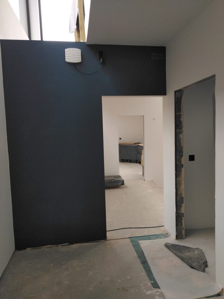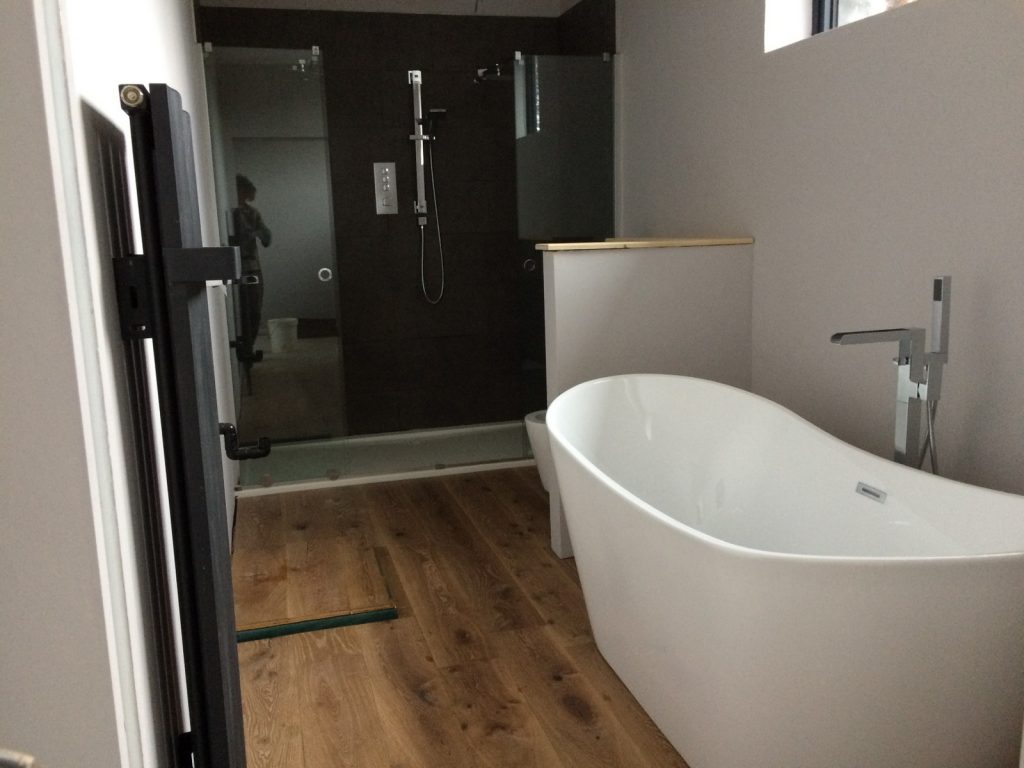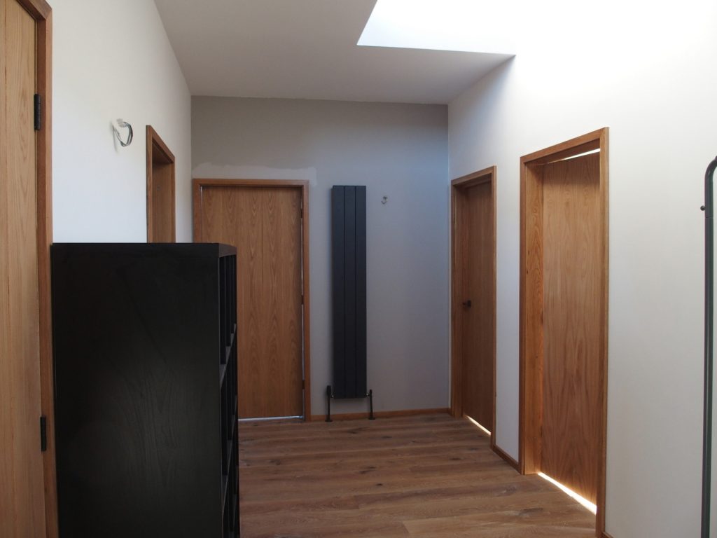 After 10 weeks from order we have all the oak doors .. well, apart from two and we’ve had Gavin, another of Alex’s recommendations as a joiner fitting the doors, oak architraves and skirtings. Couple of coats of osmo oil and they look a treat. I fitted the softwood skirting in bedrooms and workshops with a top new toy .. a nailer. Endless fakin painting but the last one done today. Also the five eclisse pocket doors are fitted and look v nice and clean.