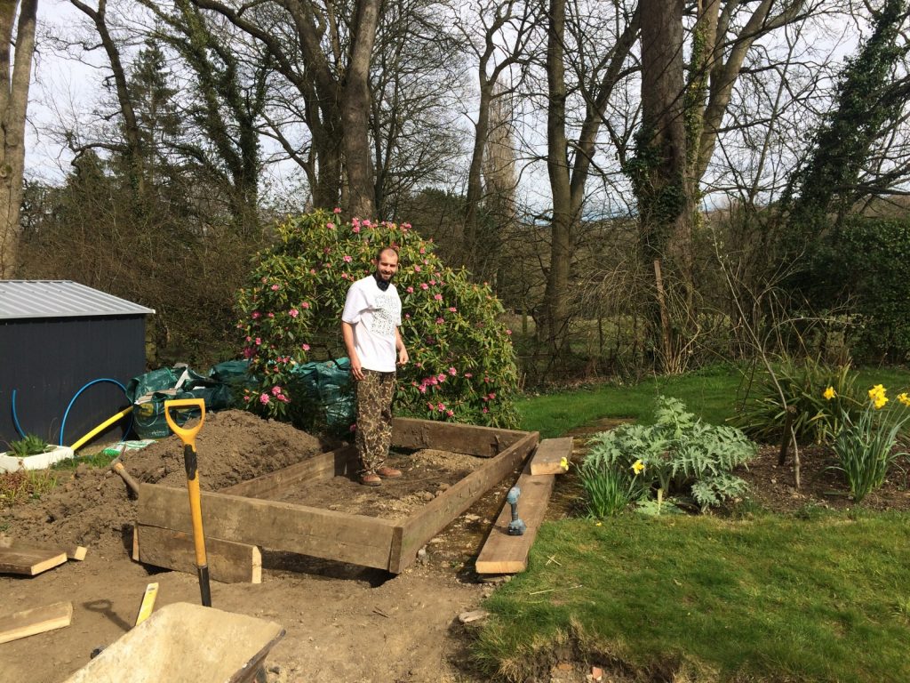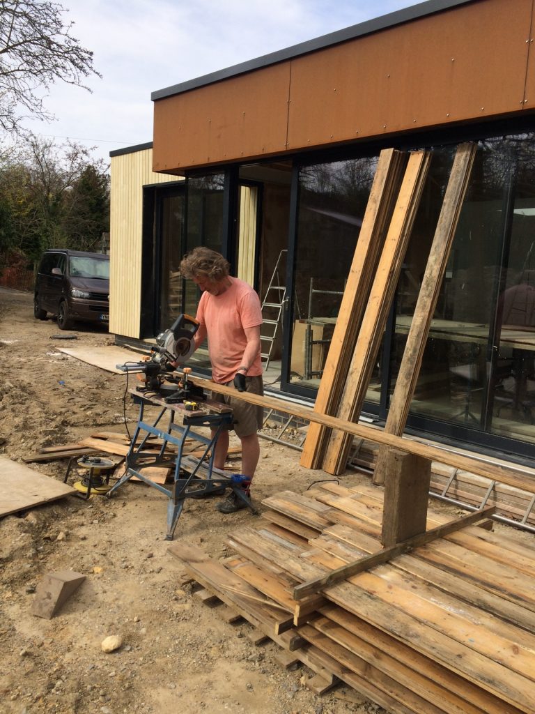 Mick is doing a couple of days a week and has finished the first floor bathroom, moved on to plaster and tile the loo and is now plastered and tiling the bathroom. Phil and team have spent the past weekends (with a couple of breaks) plastering away. We have the kitchen, utility and dining rooms done and lounge 80% complete. Unfortunately this has ground to a halt as there is no plaster available for 100 miles (or more). Ang is painting away – with the loo, kitchen and utility rooms completed. The lounge and dining rooms are next but she’s far happier in the garden and making curtains. Peter, the carpet fitter came in last week for a morning – the fifth house he’s worked on with us. Chris commissioned the boiler with no issues (other than a crisis when he thought I’d capped the radiator pipes – given that I hadn’t they promptly flooded). Andy and son – the sparkies have given us a good part of last week and we have the garage half-complete and two of the five rings (the first floor and the kitchen-utility) running. I seem to be running around doing little as usual. Alex (Ang’s eldest) and I laid the bathroom wood floor – the first couple of sqm of a huge amount to do. I make progress with techno-shite – highlights being the garage cameras, wifi, poe etc running and the house control system coming on with the heating system and some security running. Al and I have started recycling the old house timbers, with Al making raised garden beds and me preparing a wood wall.