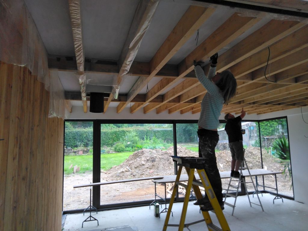 Chris – a plumber-delinguent friend has been hard at work installing the heating system in the services room and is now crawling around under the house making grunting sounds. We have a working loo !! with most water and waste services tested out. Oddjob (Phil) has finished the soundcoat, boarding and plastered the services room – waahayy we nearly have the first room of the house running – ok, minus the electrics. They’re now boarding and plastering the FirstFloor – bedroom, dressing room, bathroom and corridor. . Electrics for phone, sat-tv and solarPV are now routed onto the FF roof.