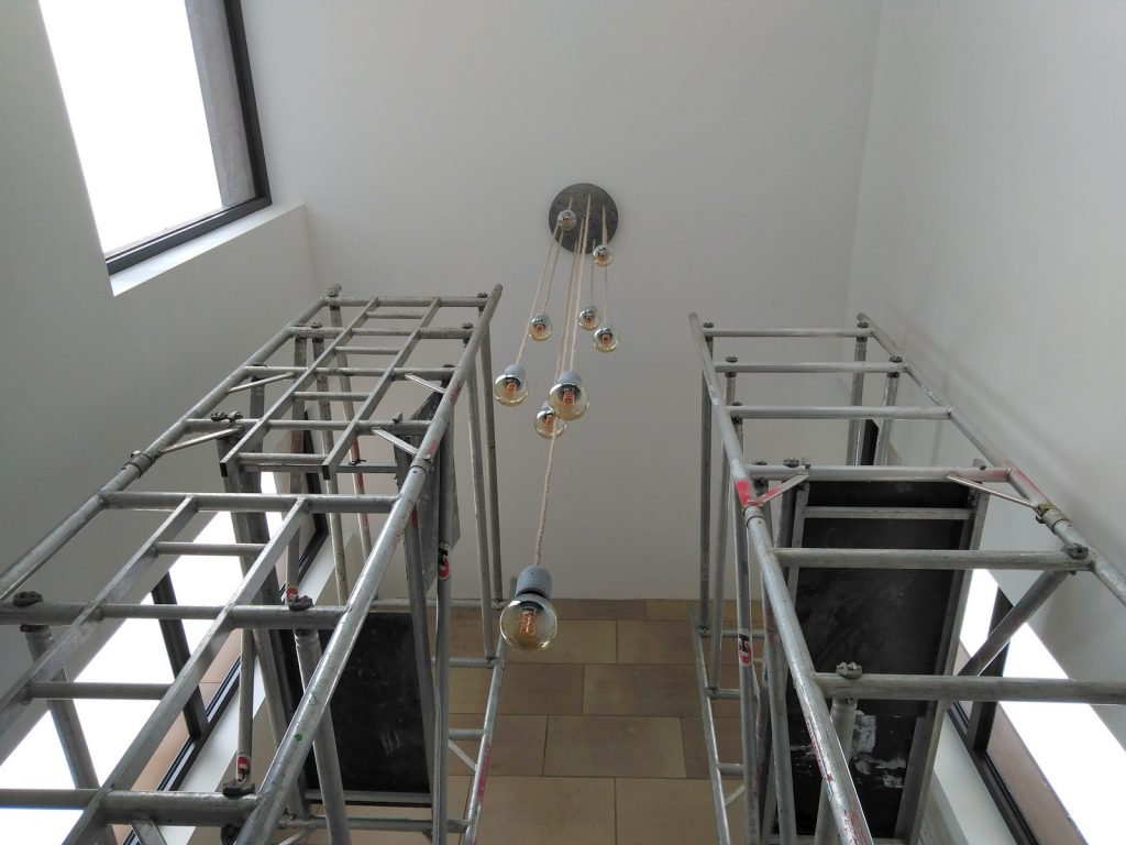 Months rather than weeks have gone by. Since the last post little happened for a few weeks with complete lack of materials and people during the covid lockdown. Bags of plaster were not available for about six weeks, with out-of-date finish being sold on gumtree for £30/bag. I faffed as much as I could, building an old-skool worktable and old wood walls in the lounge and bathroom from floor joists and boards recycled from the old house .. even then I ground to a halt. Fortunately in June Alex at Abode, whose given me great advice during the project, managed to source plaster and Stuart with team of plasters spent the month plastering the whole house. This allowed Ang (primarily), Phil, Birdie and myself to roll behind them and paint everything. The lounge ceiling with wood beams and inlaid plaster was a inordinate effort but now looks a treat. Final painting was the hallway, hiring a couple of scaffolding towers which Ang hung off reaching into corners. We re-cleaned and treated the stone-work and I made a bespoke concrete/jute chandelier.