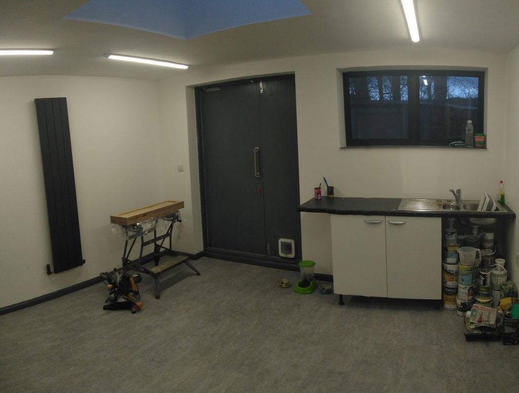 From the screeding I’ve laid the workshops and services rooms floors with a concrete-effect camaro loc flooring (50sqm). The first sqm took a day as I made a right bollocks .. the last 15sqm took half a day as I’d learnt the knack. This is true for getting the hang of most things.