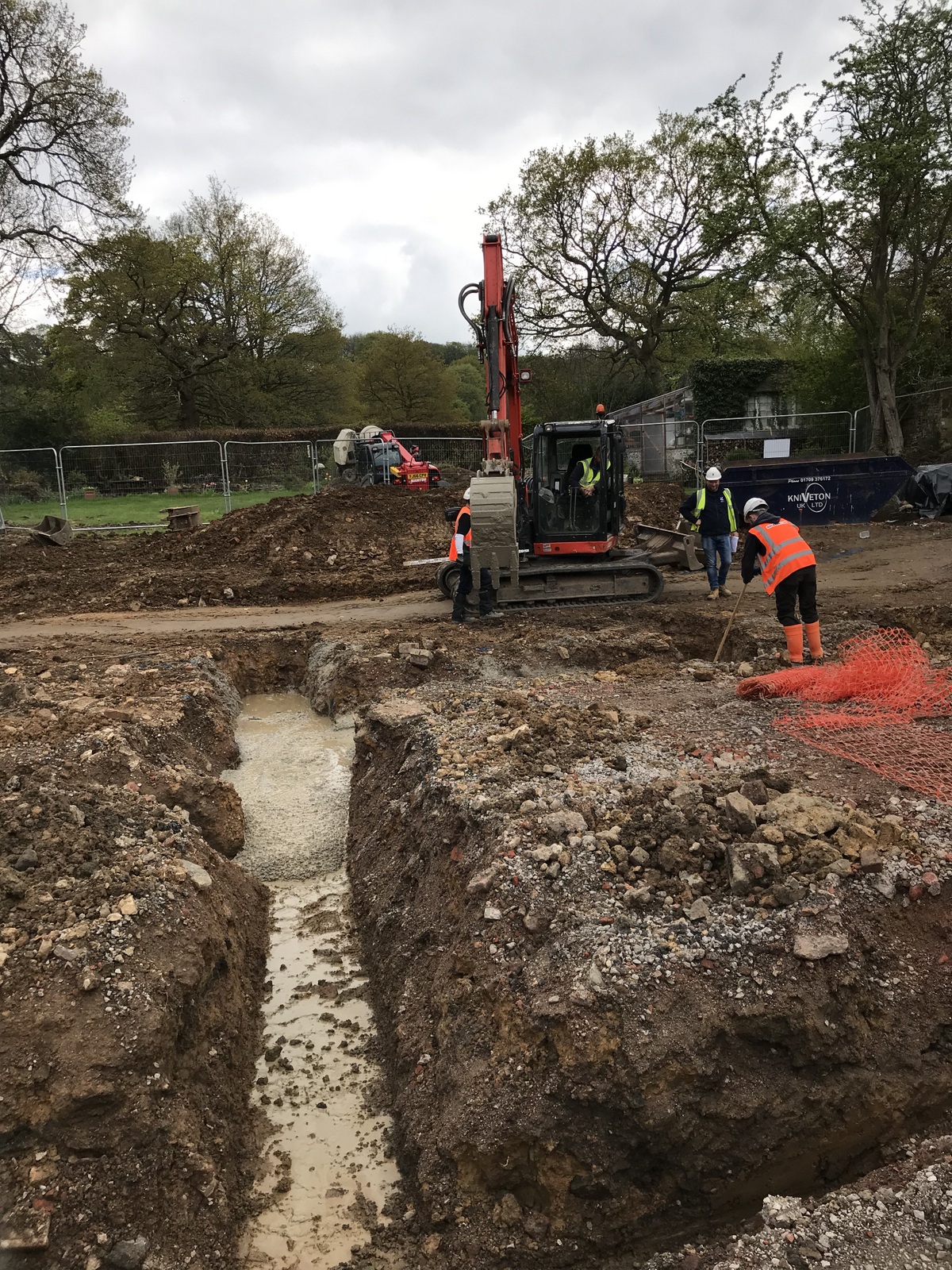 In the digging of the garage foundations we find the incoming water main which is 3/4” copper. I have to crawl into the foundations and dig under a laurel tree to find decent pipe which has a/ been bent by the digging and b/ gone oval with 40 years of ground weight on it. Many hours later I finally get a watertight joint using a 3/4” olive into 22mm copper into 25mm mdpe pipe. These messy joints have to last the future of the house.