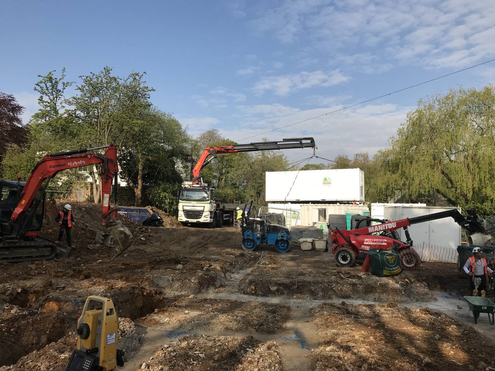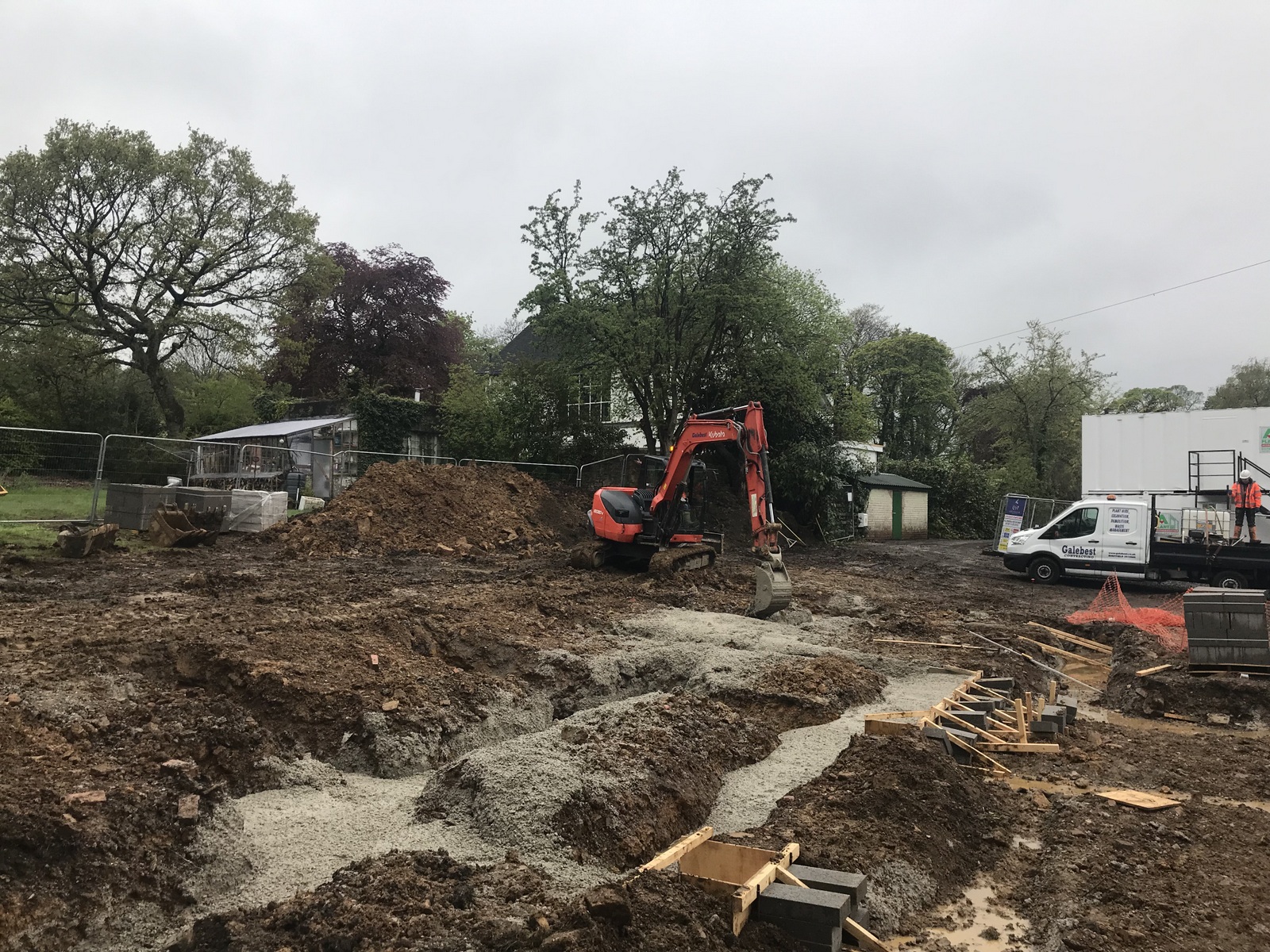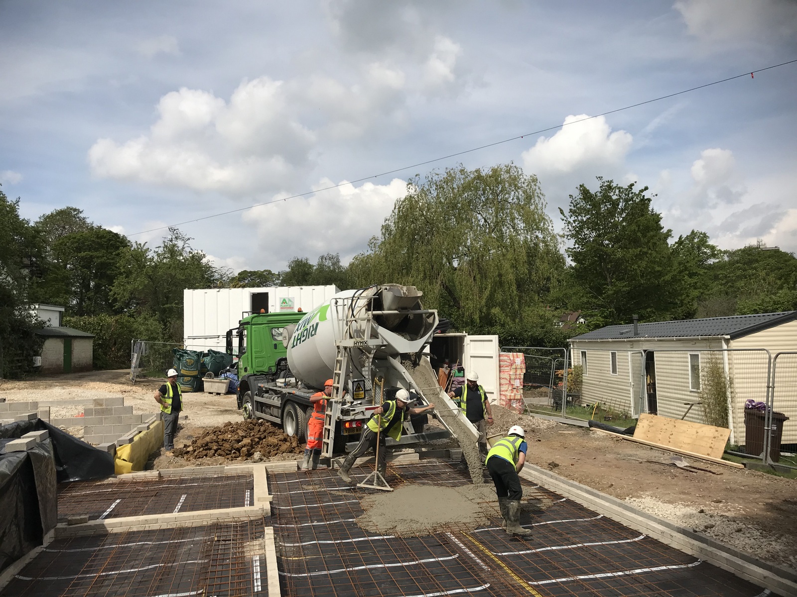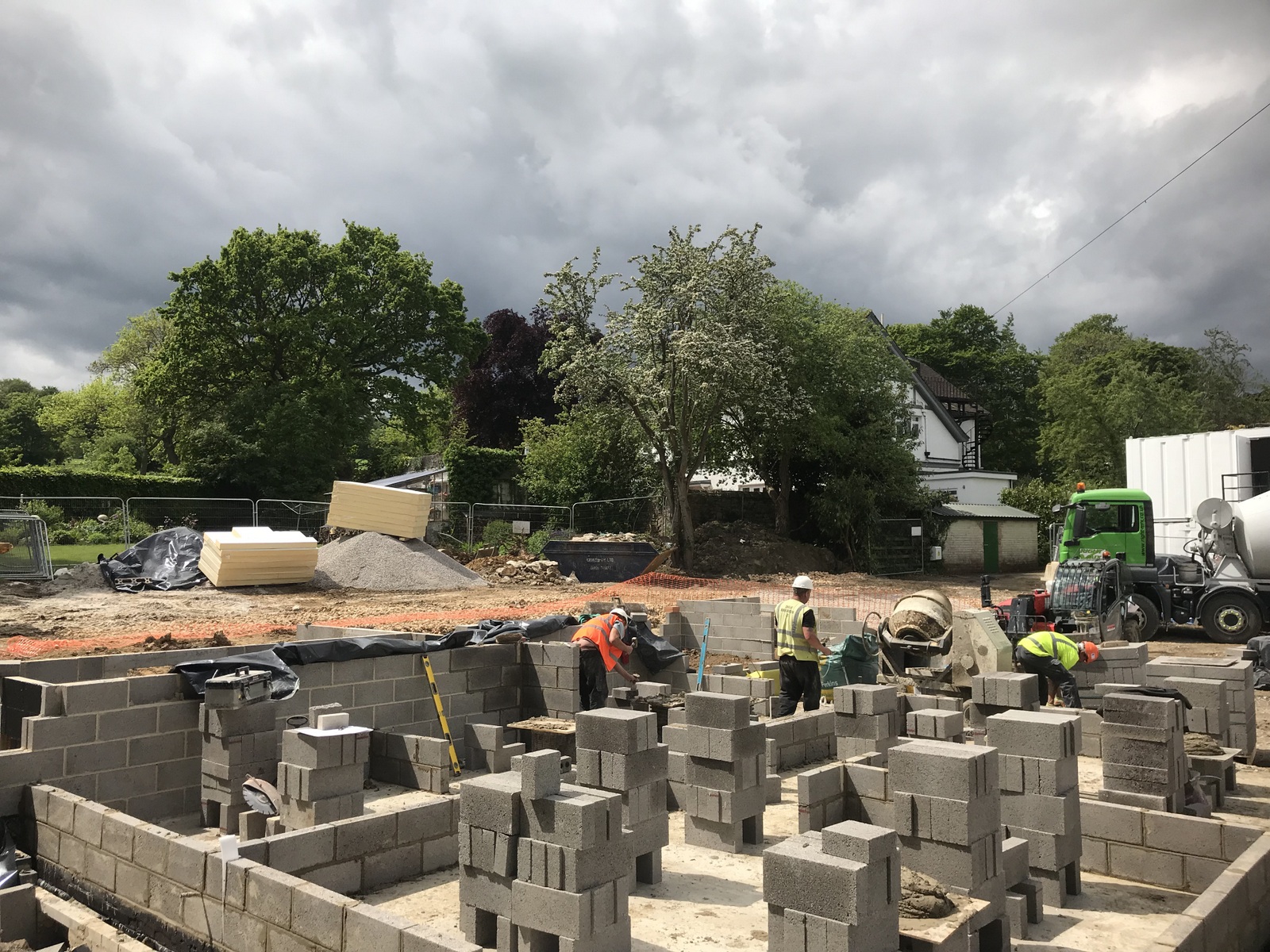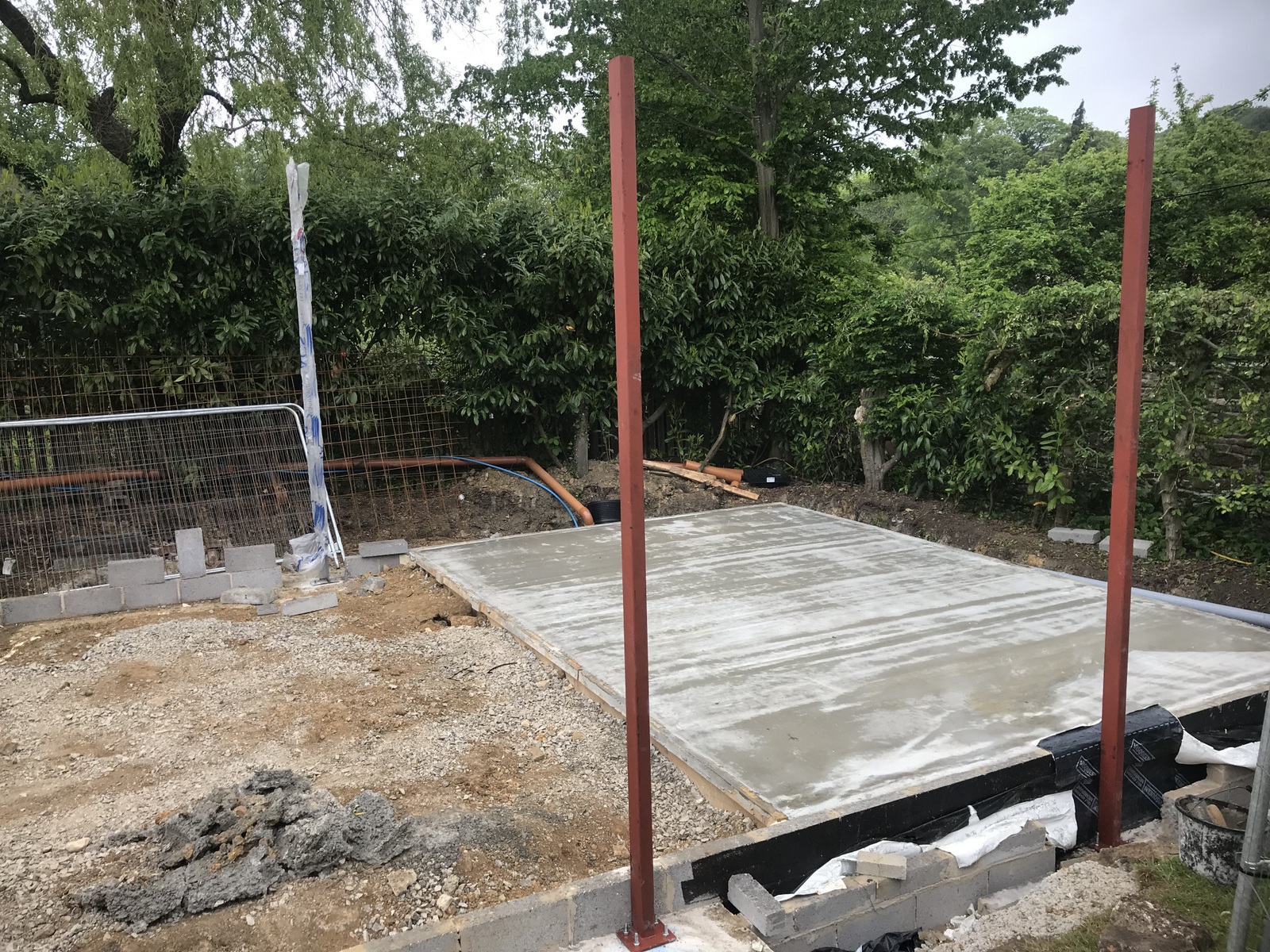 A four day week but things are moving nicely. The design has been updated and released from tender status and particularly QSP’s inputs on choice of materials and build methods. The engineer has been laying out the site. The lower ground floor foundations have been dug and ready for concrete to be poured . A steady stream of lorries come and go with materials, sheds and machinery. We’re also getting to know the guys and the feel of how the project will work.