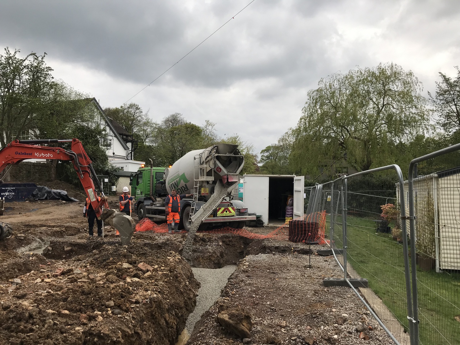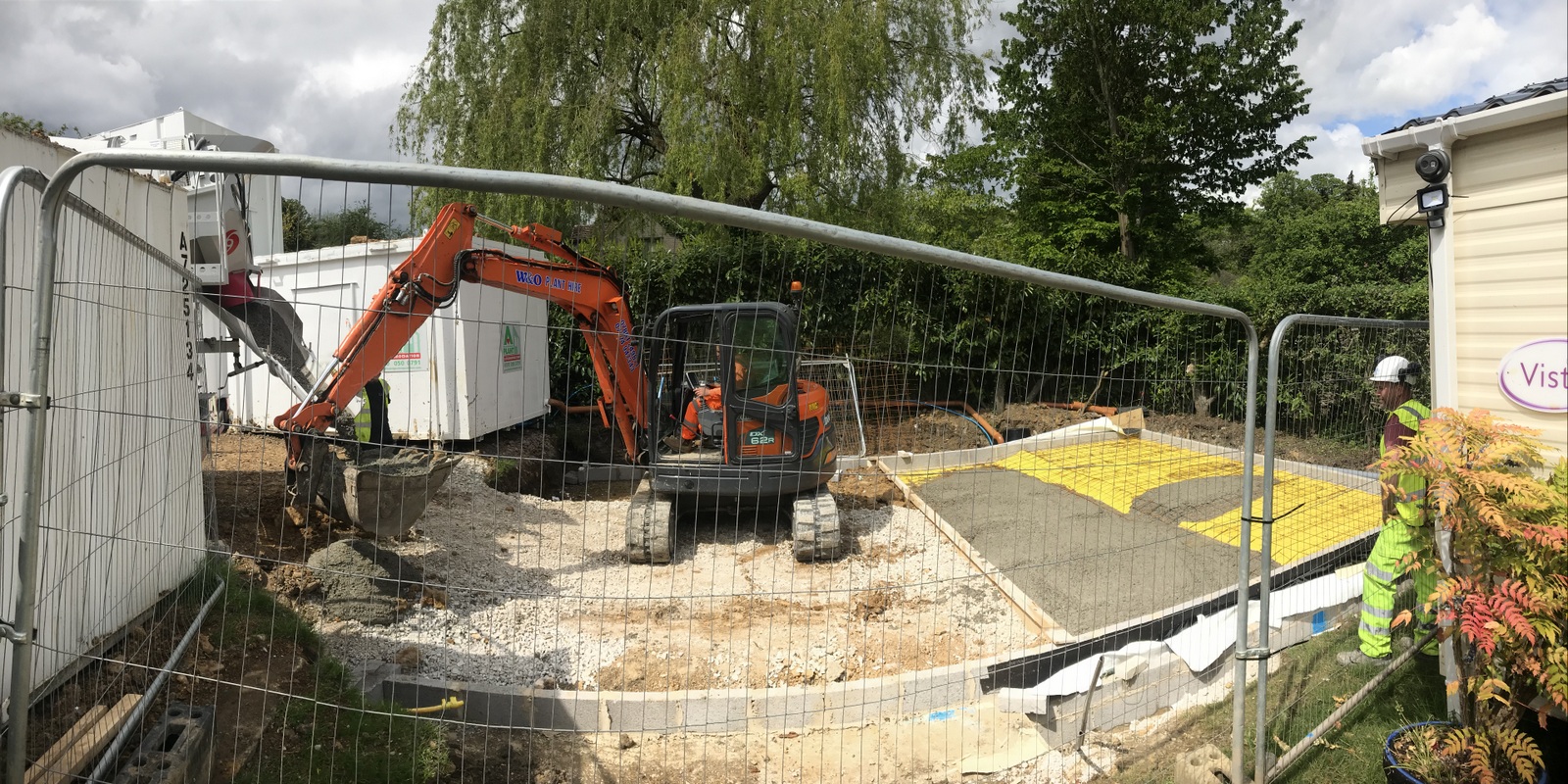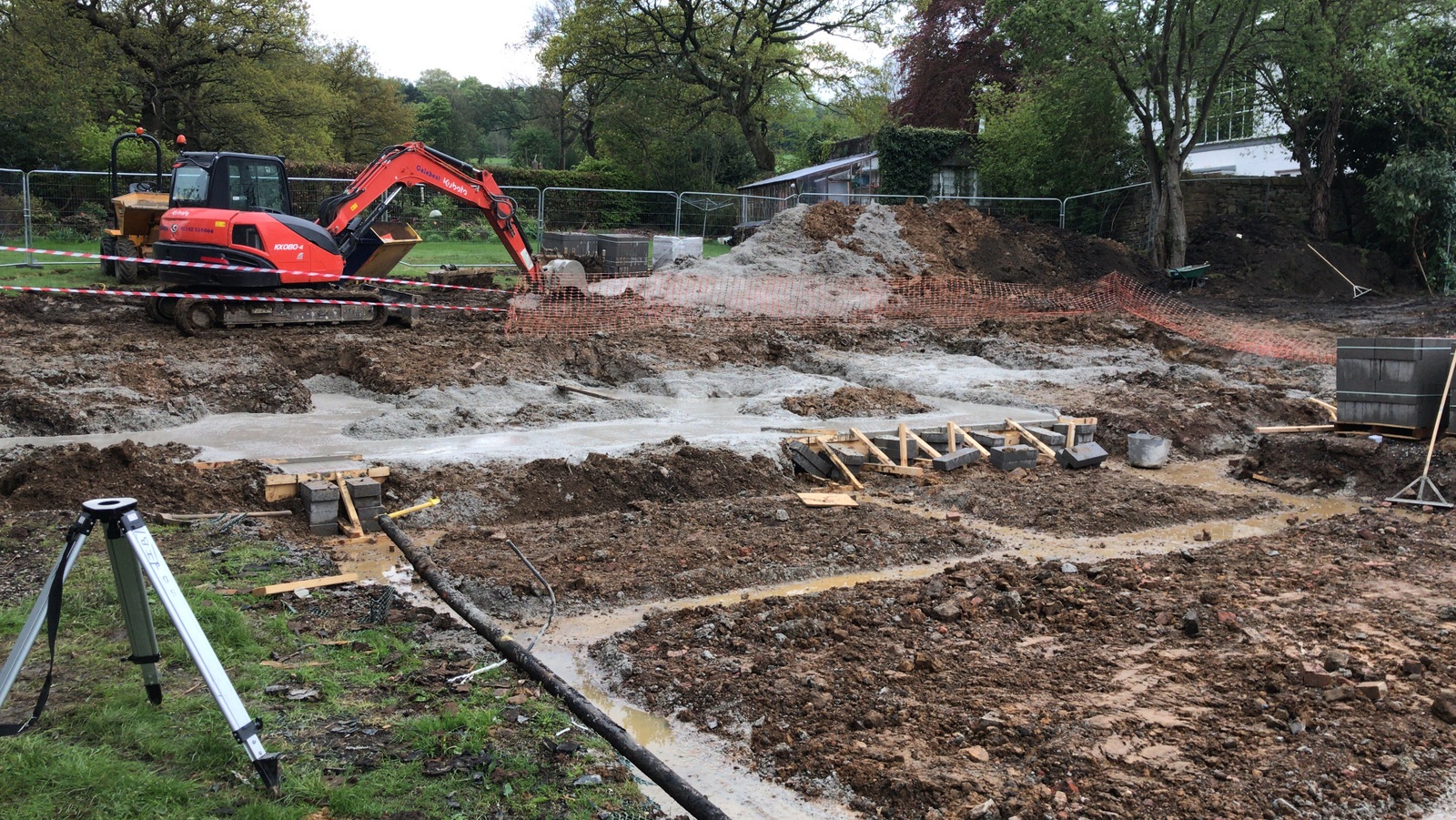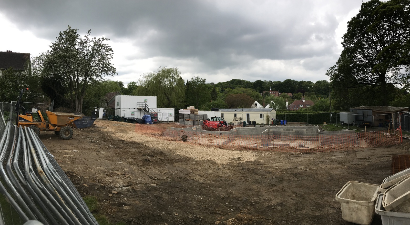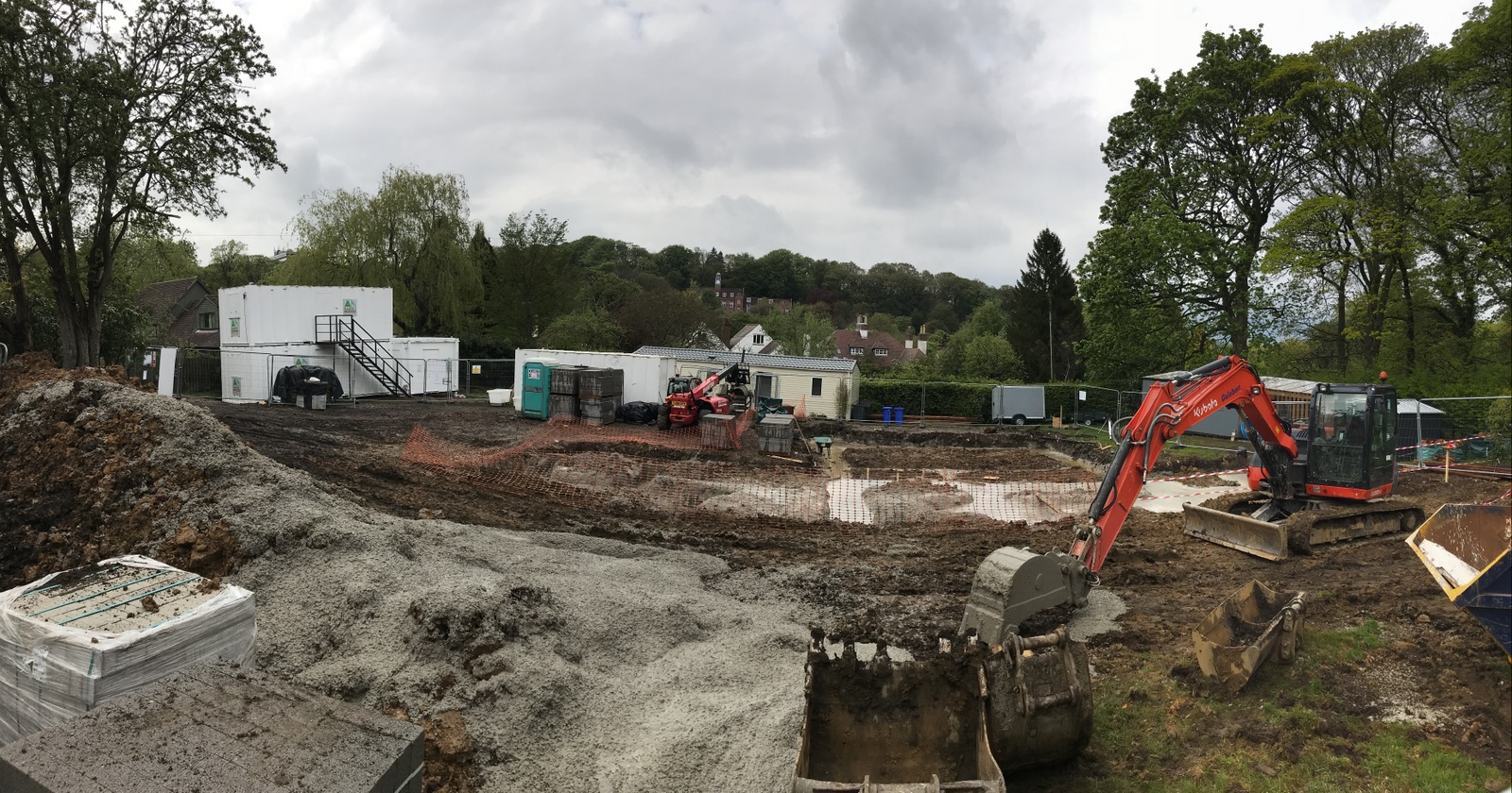 A four day week but things are moving nicely. The design has been updated and released from tender status and particularly QSP’s inputs on choice of materials and build methods. The engineer has been laying out the site. The lower ground floor foundations have been dug and ready for concrete to be poured . A steady stream of lorries come and go with materials, sheds and machinery. We’re also getting to know the guys and the feel of how the project will work.