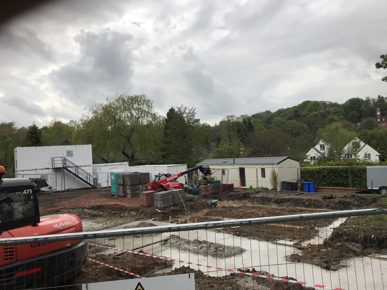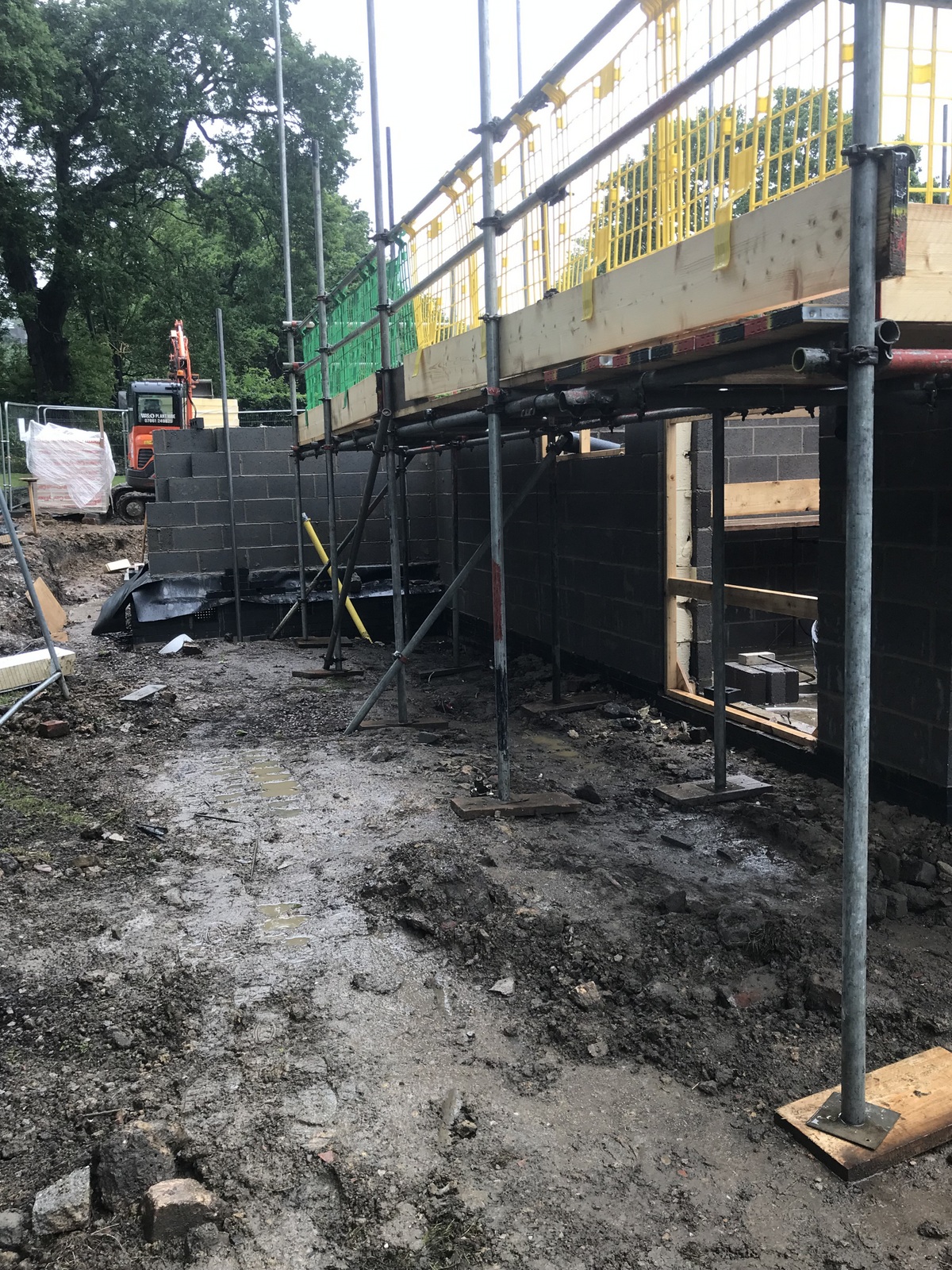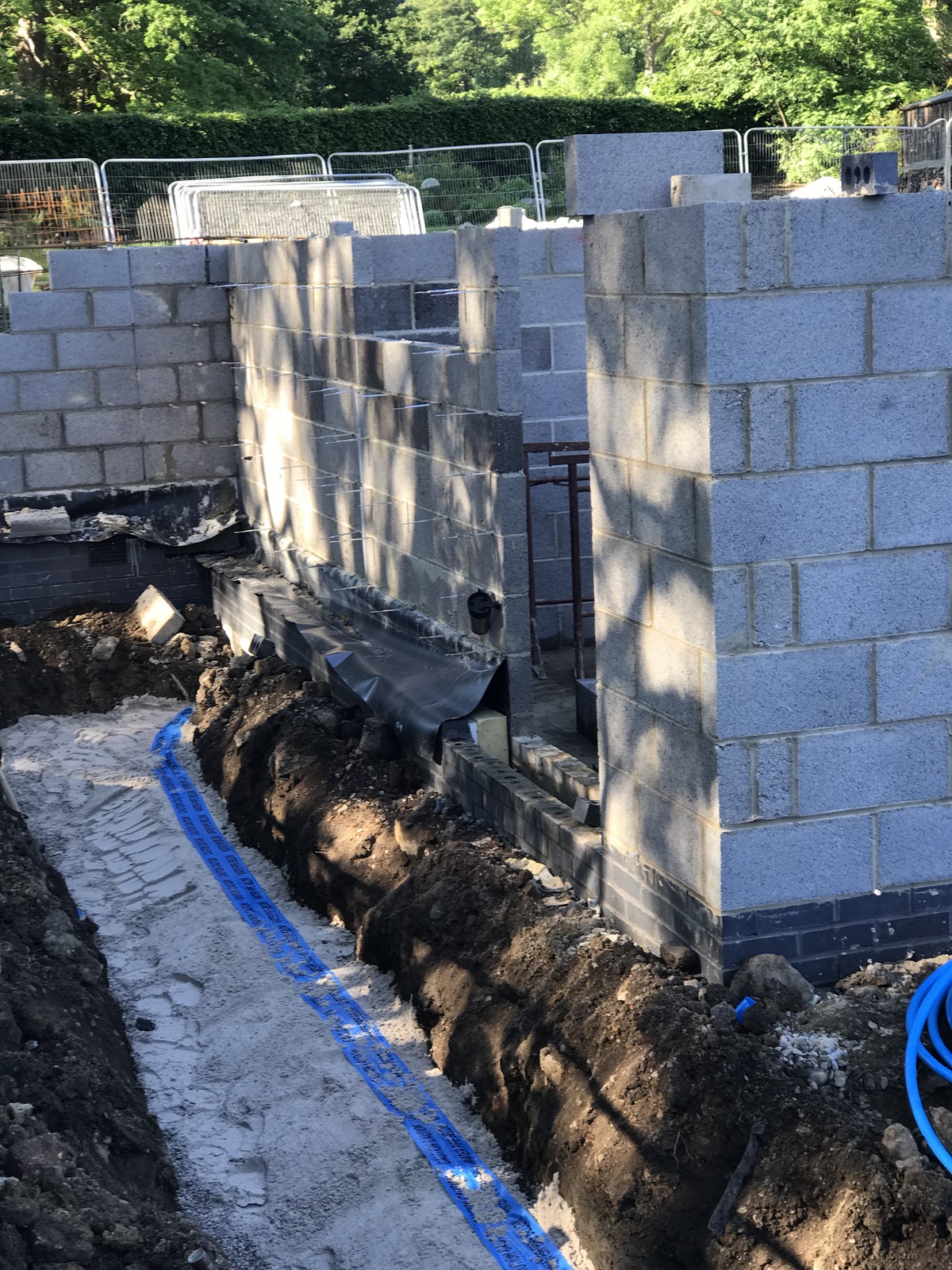 The services trench between the garage and house was 50% dug (the store is in the way for the rest), filled in, dug again, water/gas/electricity/ethernet laid and filled in again to allow the scaffolding around the LGF (lower ground floor). It’ll need to be dug again (for the third time) for the drainage. We’re seeing the different trades eg groundworks, brickies getting in the way of each other.