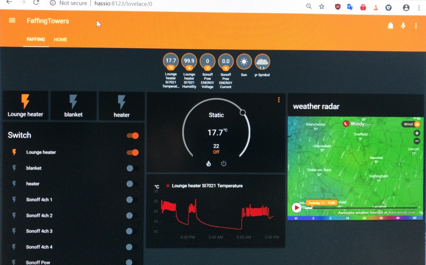 In the wet weather I’ve had an almighty techno-faff prototyping a home control system. I now have a number of devices connected to a network, mqtt server and homeassistant on a odroid embedded computer that provides the automation, UI frontend and iphone app.